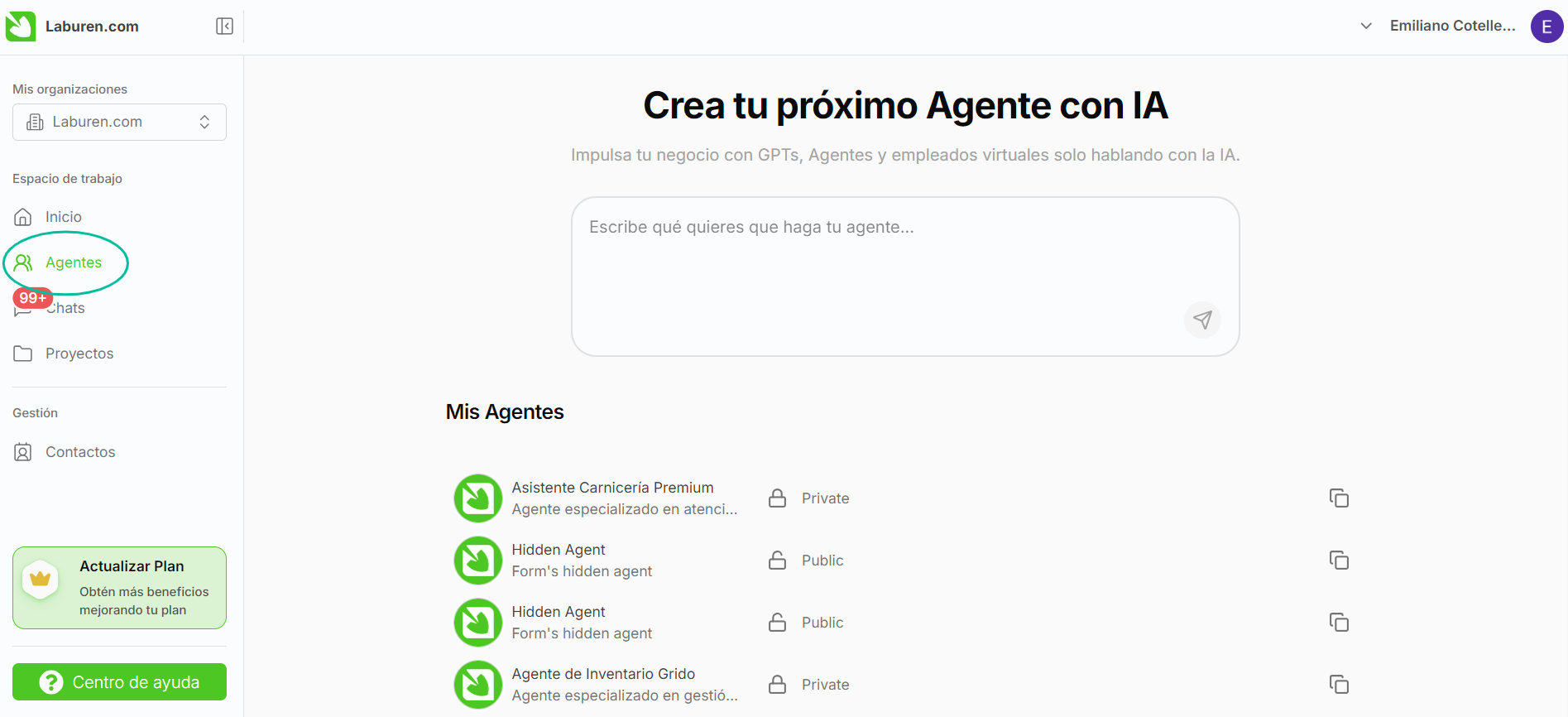 Desde esta sección podés crear, gestionar y visualizar todos los agentes de inteligencia artificial asociados a tu empresa. Es el espacio central para administrar tus asistentes virtuales y sus configuraciones.