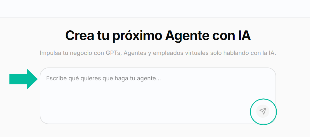 En la parte superior de la página encontrarás el cuadro "Crea tu próximo Agente con IA". Solo necesitás escribir en el campo de texto las instrucciones de lo qué querés que haga tu agente (por ejemplo: "Atender consultas de clientes de mi tienda online" o "Gestionar inventario de productos").