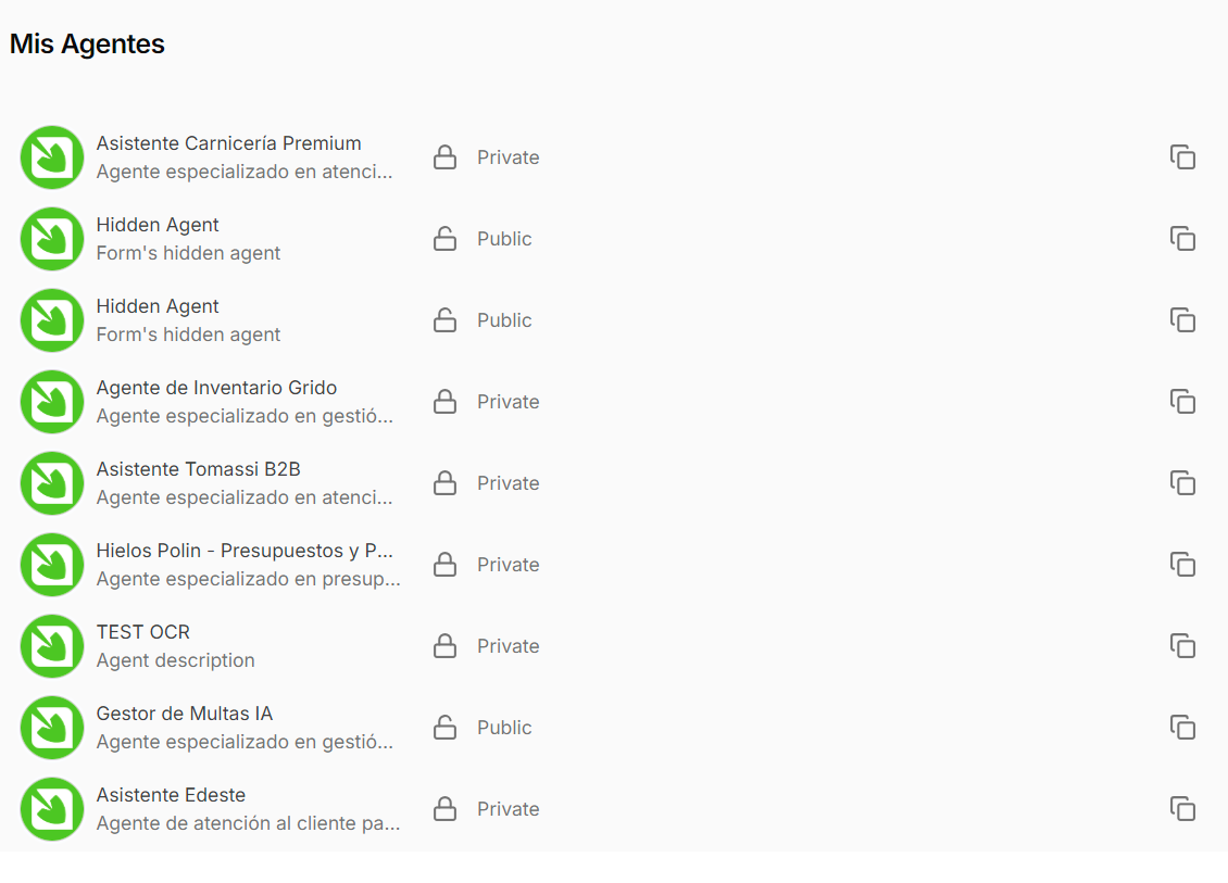 Ícono de duplicar → permite copiar el enlace o duplicar la configuración del agente para crear una nueva versión rápidamente.