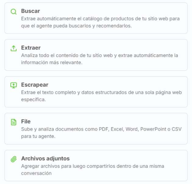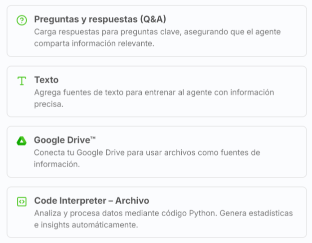 Cuándo usarla: Para subir manuales de procedimientos, políticas de la empresa, listas de precios fijas o guiones de venta que ya tengas redactados.