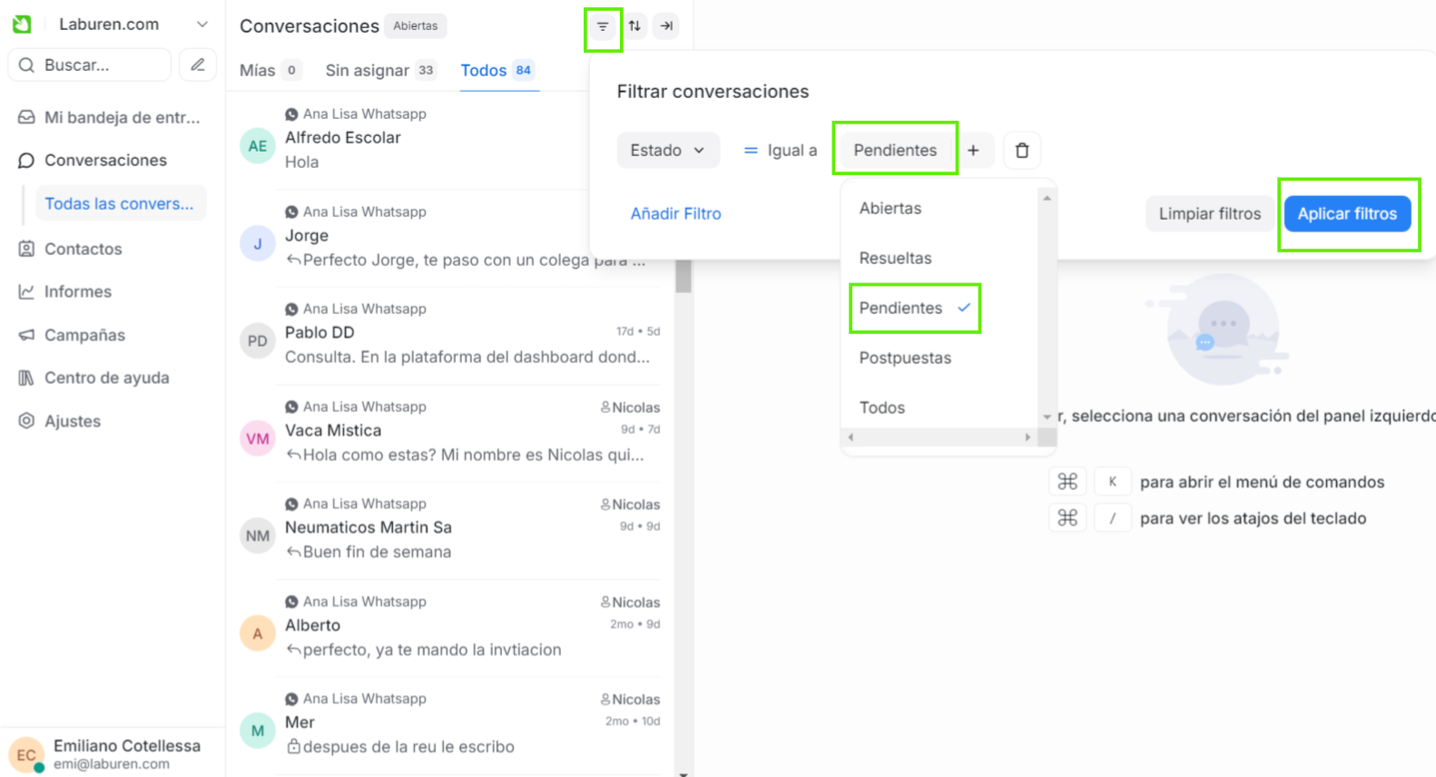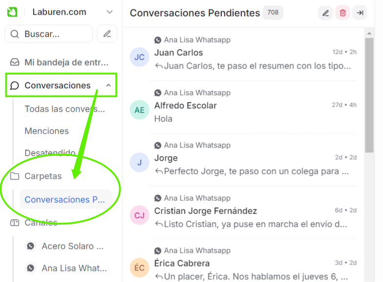 Una vez que guardes el filtro podrás encontrarlo dentro del menú lateral Conversaciones y luego en Carpetas. En este caso aparecerá con el nombre "Conversaciones Pendientes".