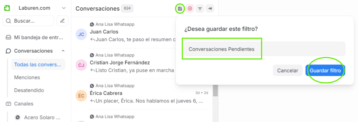 Crea el filtro que necesites, tal como se indica en la guía "Ver todas las conversaciones en CRM". En este ejemplo creamos el filtro "Conversaciones pendientes".